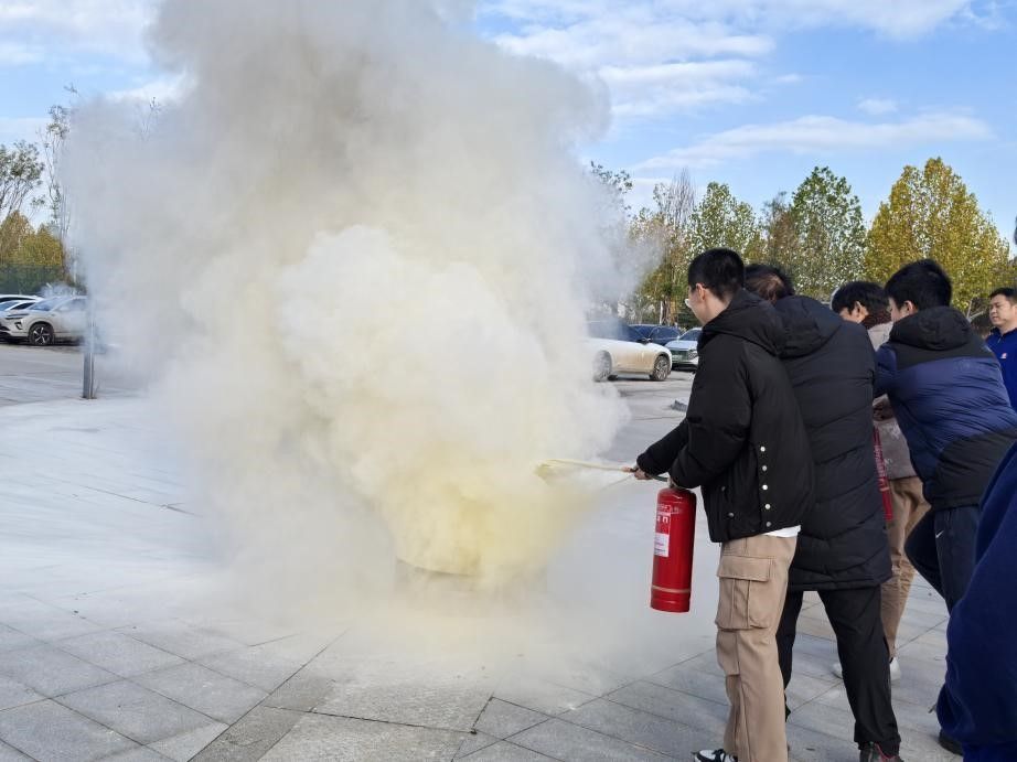 理论授课结束后,全体师生移步室外开展实操教学。许磊老师详细讲解了干粉灭火器的相关知识及使用要点,并现场进行操作示范。随后,参训师生在指导下依次进行灭火器实操练习,确保基本掌握灭火器使用方法,提升应对初期火灾的能力。
