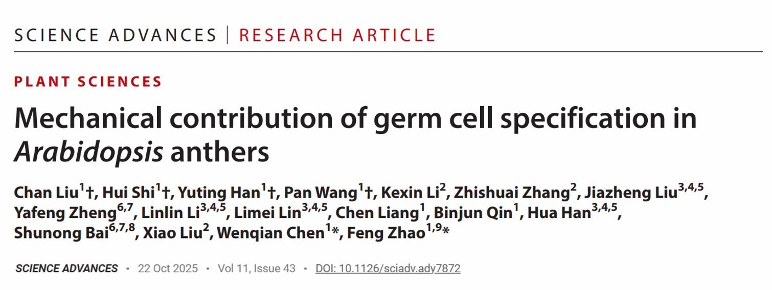 2025年10月22日,我校生态环境学院赵峰教授团队联合北京航空航天大学、北京大学及中国科学院自动化研究所多家单位在《Science Advances》发表了题为“Mechanical contribution of germ cell specification in Arabidopsis anthers”的最新原创研究成果。